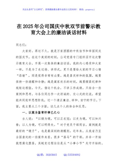 / 在2025年公司国庆中秋双节前警示教育大会上的廉洁谈话材料
