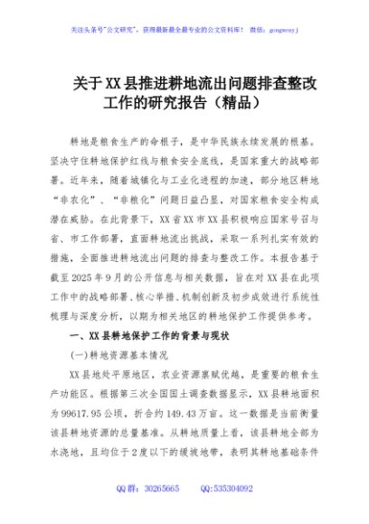 / 关于XX县推进耕地流出问题排查整改工作的研究报告(精品)