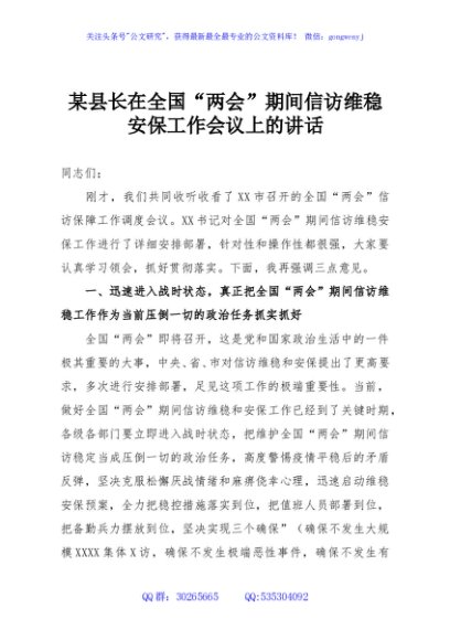 / 某县长在全国“两会”期间信访维稳安保工作会议上的讲话