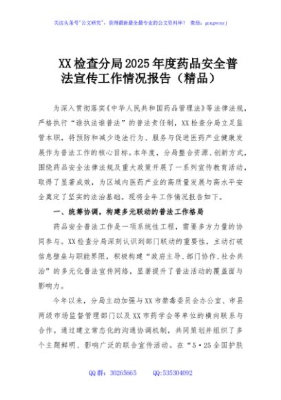 / XX检查分局2025年度药品安全普法宣传工作情况报告(精品)