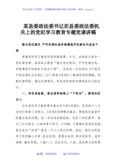 / 某县委政法委书记在县委政法委机关上的党纪学习教育专题党课讲稿