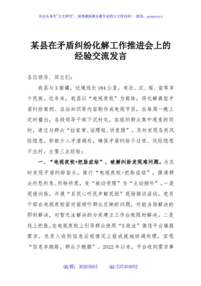 / 某县在矛盾纠纷化解工作推进会上的经验交流发言