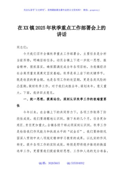 / 在XX镇2025年秋季重点工作部署会上的讲话