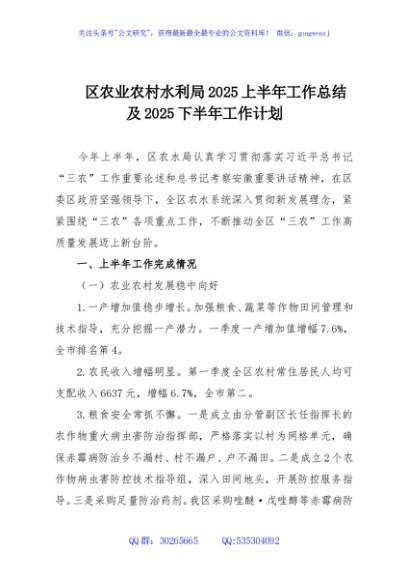 / 区农业农村水利局2025上半年工作总结及2025下半年工作计划