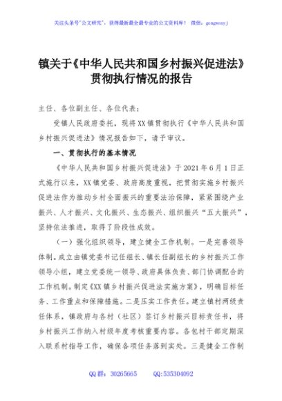 / 镇关于《中华人民共和国乡村振兴促进法》贯彻执行情况的报告