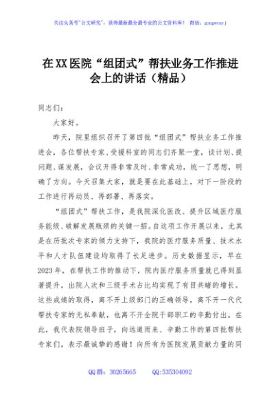 / 在XX医院“组团式”帮扶业务工作推进会上的讲话(精品)
