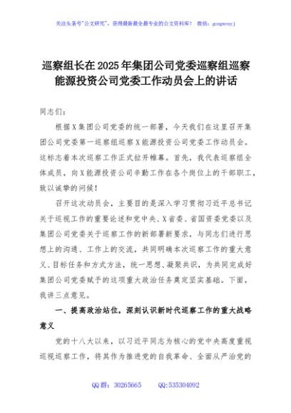 / 巡察组长在2025年集团公司党委巡察组巡察能源投资公司党委工作动员会上的讲话
