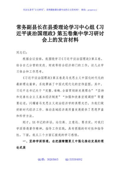 / 常务副县长在县委理论学习中心组《习近平谈治国理政》第五卷集中学习研讨会上的发言材料