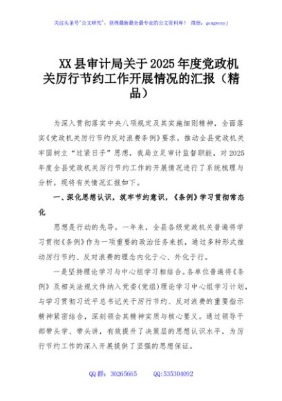 / XX县审计局关于2025年度党政机关厉行节约工作开展情况的汇报(精品)
