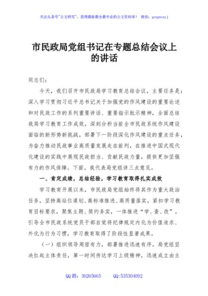 / 市民政局党组书记在专题总结会议上的讲话