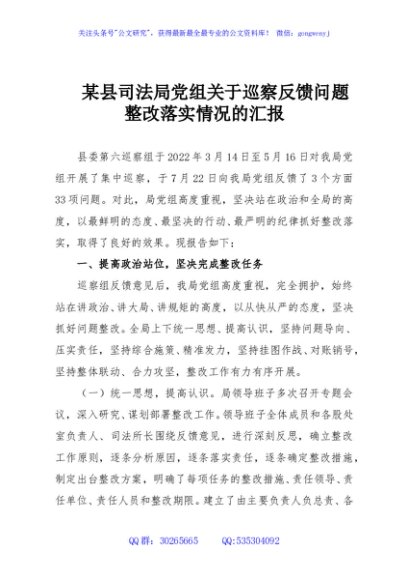 / 某县司法局党组关于巡察反馈问题整改落实情况的汇报