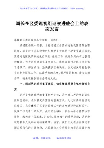 / 局长在区委巡视组巡察进驻会上的表态发言