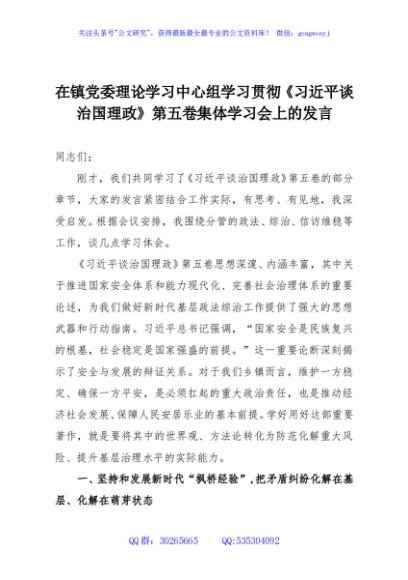 / 在镇党委理论学习中心组学习贯彻《习近平谈治国理政》第五卷集体学习会上的发言