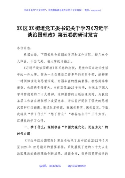 / XX区XX街道党工委书记关于学习《习近平谈治国理政》第五卷的研讨发言