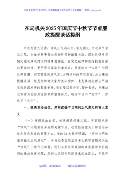/ 在局机关2025年国庆节中秋节节前廉政提醒谈话提纲