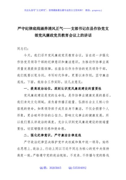 / 严守纪律底线涵养清风正气——支部书记在县作协党支部党风廉政党员教育会议上的讲话