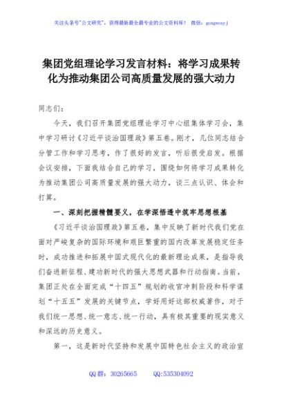 / 集团党组理论学习发言材料:将学习成果转化为推动集团公司高质量发展的强大动力