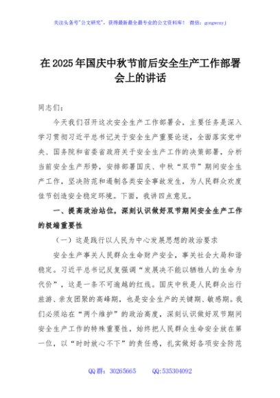 / 在2025年国庆中秋节前后安全生产工作部署会上的讲话