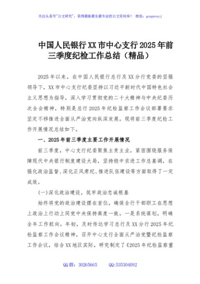 / 中国人民银行XX市中心支行2025年前三季度纪检工作总结(精品)