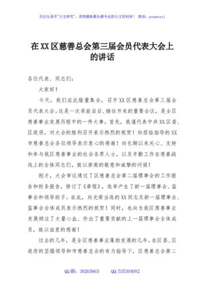 / 在XX区慈善总会第三届会员代表大会上的讲话