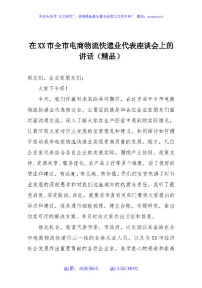 / 在XX市全市电商物流快递业代表座谈会上的讲话(精品)