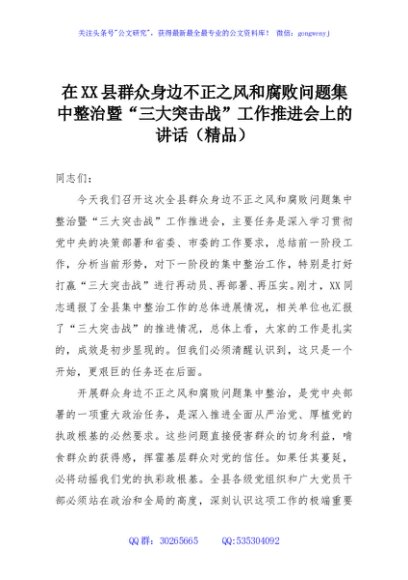 / 在XX县群众身边不正之风和腐败问题集中整治暨“三大突击战”工作推进会上的讲话(精品)