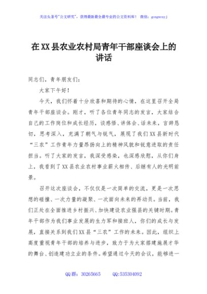 / 在XX县农业农村局青年干部座谈会上的讲话