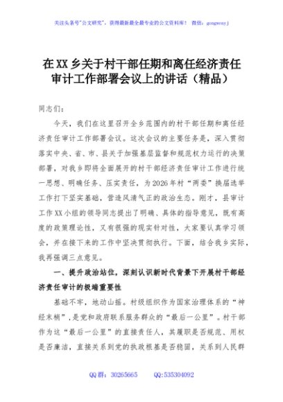 / 在XX乡关于村干部任期和离任经济责任审计工作部署会议上的讲话(精品)