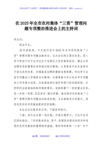 / 在2025年全市农村集体“三资”管理问题专项整治推进会上的主持词