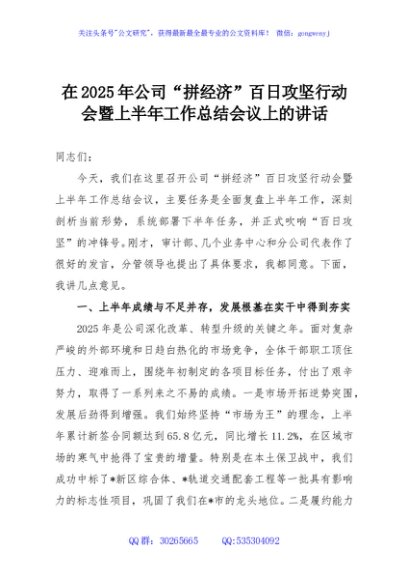 / 在2025年公司“拼经济”百日攻坚行动会暨上半年工作总结会议上的讲话