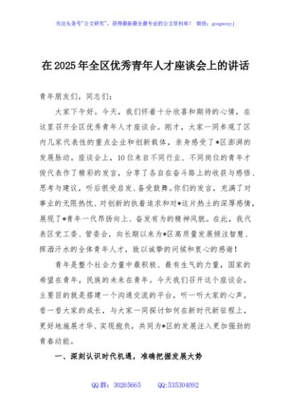 / 在2025年全区优秀青年人才座谈会上的讲话