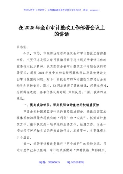 / 在2025年全市审计整改工作部署会议上的讲话