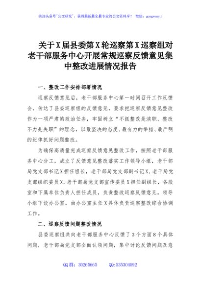 / 关于X届县委第X轮巡察第X巡察组对老干部服务中心开展常规巡察反馈意见集中整改进展情况报告