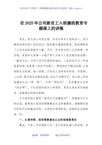 / 在2025年公司新员工入职廉政教育专题课上的讲稿