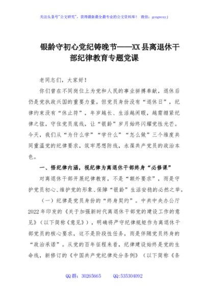 / 银龄守初心党纪铸晚节——XX县离退休干部纪律教育专题党课