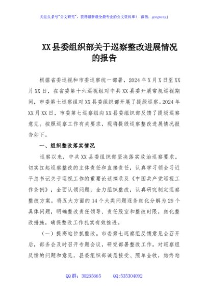 / XX县委组织部关于巡察整改进展情况的报告