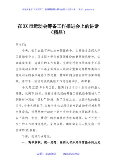 / 在XX市运动会筹备工作推进会上的讲话(精品)
