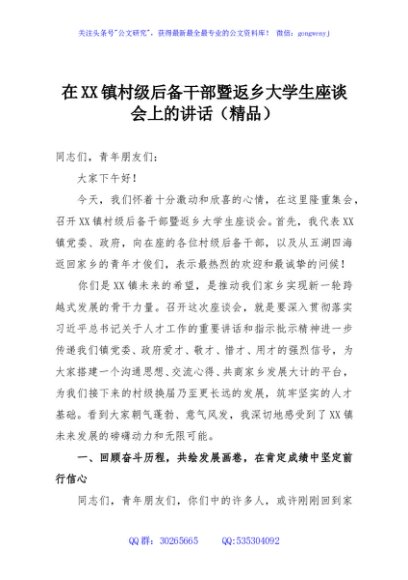 / 在XX镇村级后备干部暨返乡大学生座谈会上的讲话(精品)