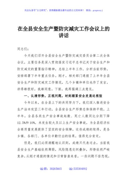/ 在全县安全生产暨防灾减灾工作会议上的讲话