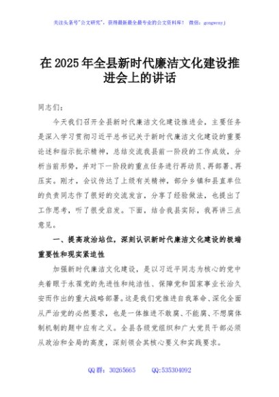 / 在2025年全县新时代廉洁文化建设推进会上的讲话