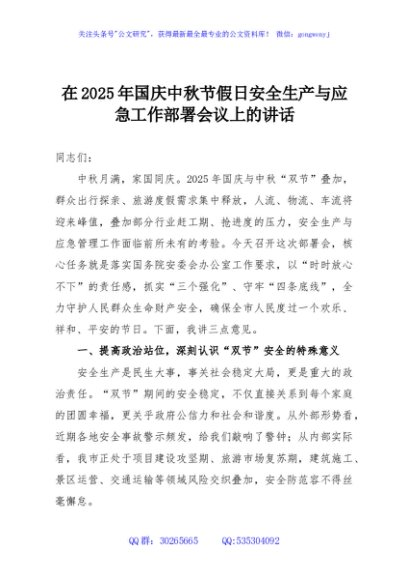 / 在2025年国庆中秋节假日安全生产与应急工作部署会议上的讲话