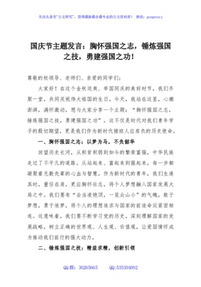 国庆节主题发言:胸怀强国之志,锤炼强国之技,勇建强国之功!