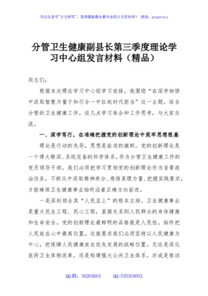 / 分管卫生健康副县长第三季度理论学习中心组发言材料(精品)