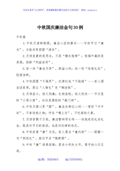 / 中秋国庆廉洁金句30例