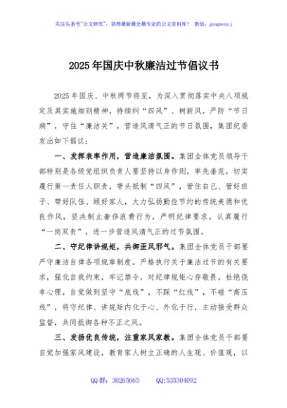 / 2025年国庆中秋廉洁过节倡议书