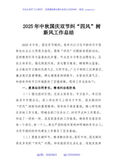/ 2025年中秋国庆双节纠“四风”树新风工作总结