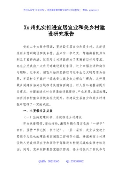 / Xx州扎实推进宜居宜业和美乡村建设研究报告