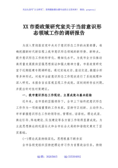 / XX市委政策研究室关于当前意识形态领域工作的调研报告