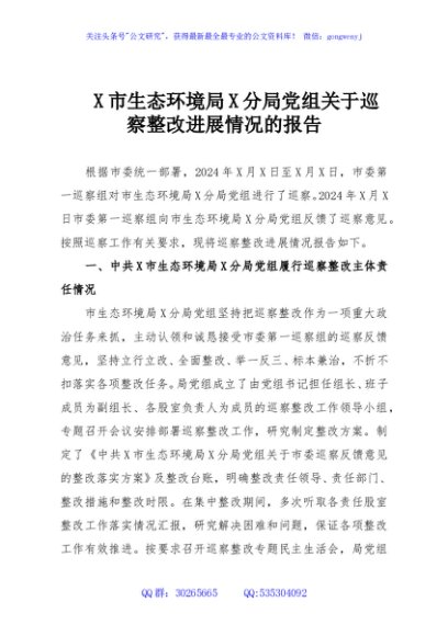 / X市生态环境局X分局党组关于巡察整改进展情况的报告