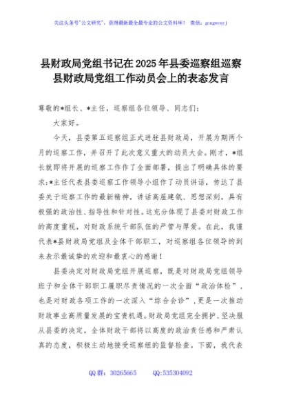 / 县财政局党组书记在2025年县委巡察组巡察县财政局党组工作动员会上的表态发言